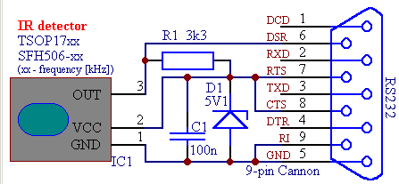 Poniżej zamieszczam schemat odbiornika podczerwieni podłączanego do portu szeregowego, którego opis był zamieszczony w CHIPie 11/2000. Układ jest bardzo prosty i współpracuje z wszystkimi pilotami, niestety do dekodowania rozkazów używa komputera PC, stąd jego wysokie wymagania jeśli chodzi o sprzęt (minimum 300MHz). Program dekodujący (np. Girder), realizuje rozkazy odebrane z pilota takie jak regulacja głośności, przemieszczanie myszy i wiele innych. Schemat układu poniżej.